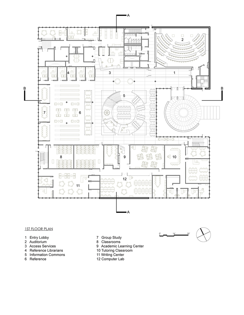 The Learning Resource Center presents opportunities for team-based learning, experiential learning, and problem-based learning by providing a variety of learning environments: group study rooms, seminar rooms, flat-floor computer classrooms, open tutoring classrooms, and a 100-seat lecture hall. At the heart of the building, beneath the lantern, lies the Information Commons, which accommodates computer workstations, technology and reference help desks, and casual reading areas. The Center for Academic Excellence is on axis with the Information Commons and flanked by the College’s Writing Center. The College’s Boardroom, Faculty Athenaeum, offices, and Reading Room occupy the second floor, as do the library stacks, which are lined with carrels for individual study.