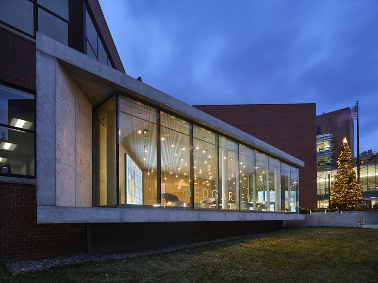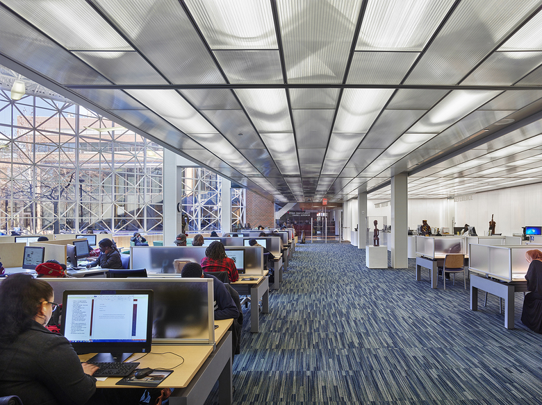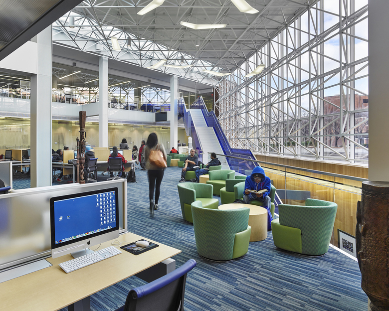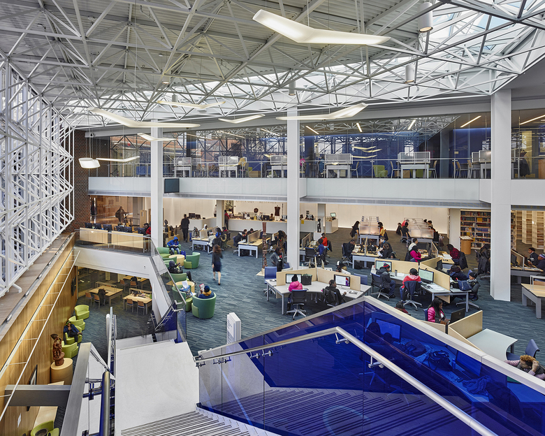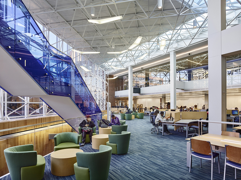 In addition to dramatically transforming the interior space, the renovation transforms the program of the 1980s library, replacing its mostly individual study areas and book-rich collection to support a more collaborative learning environment. Included are collaborative study areas, technology-rich classrooms, a new media center and casual seating throughout.