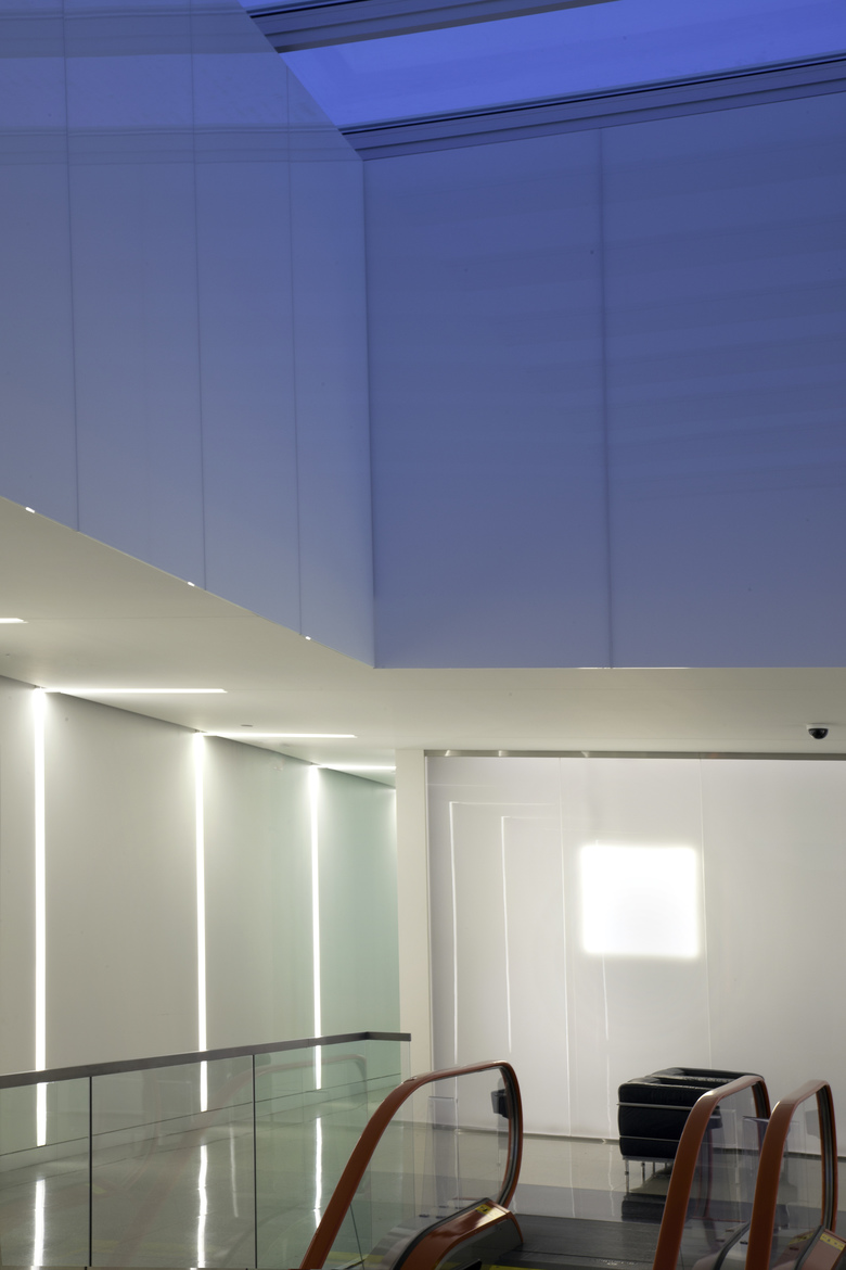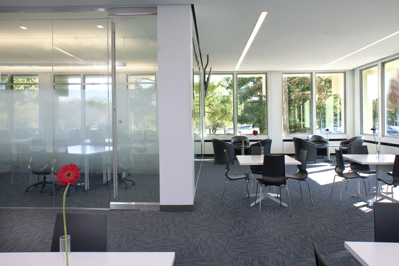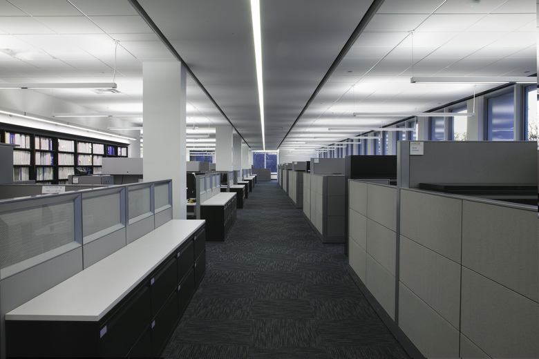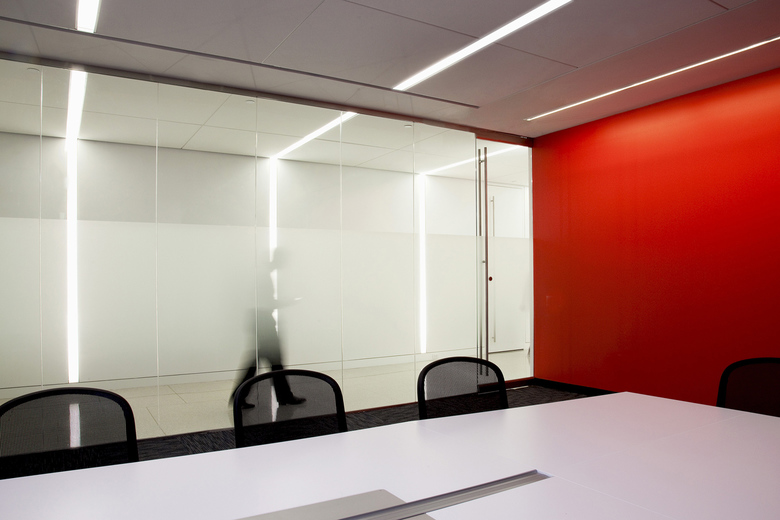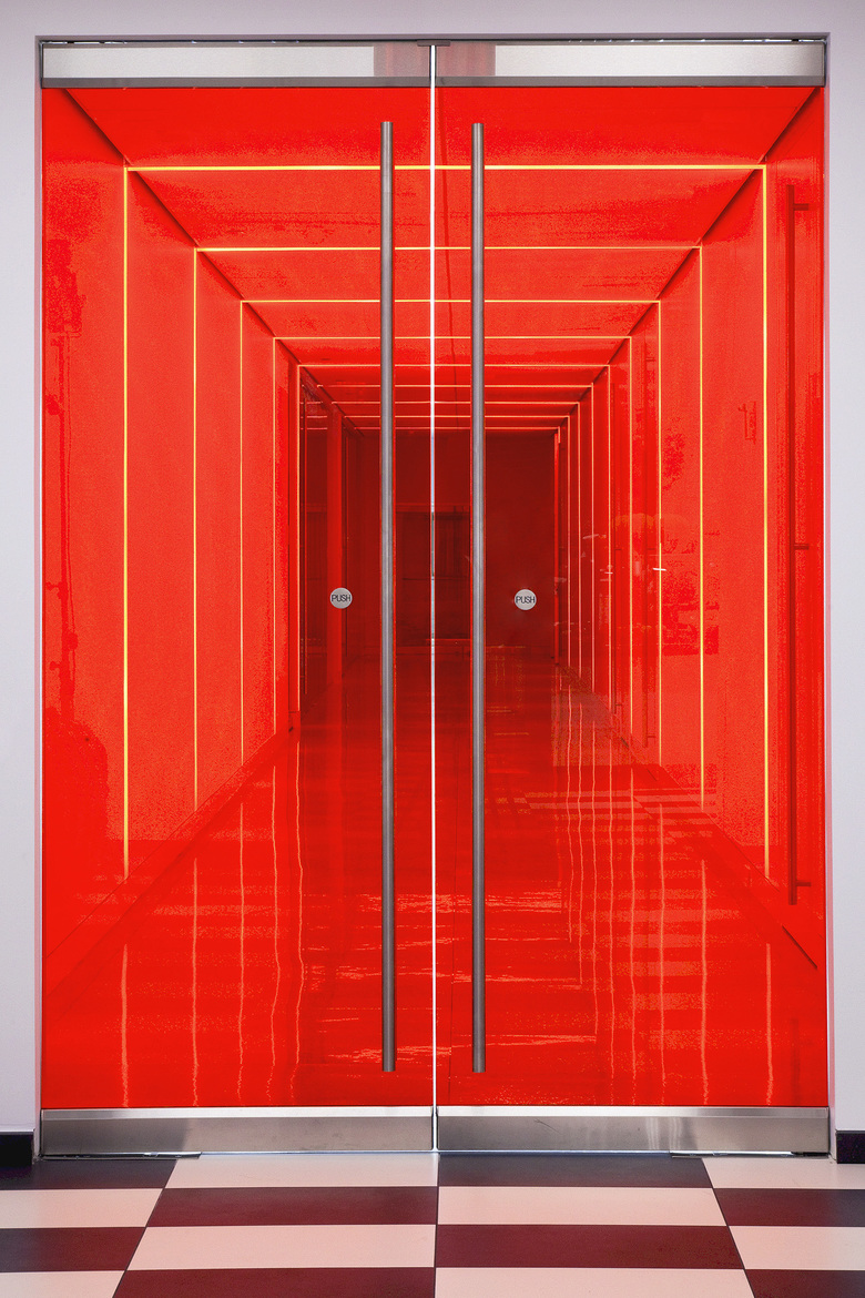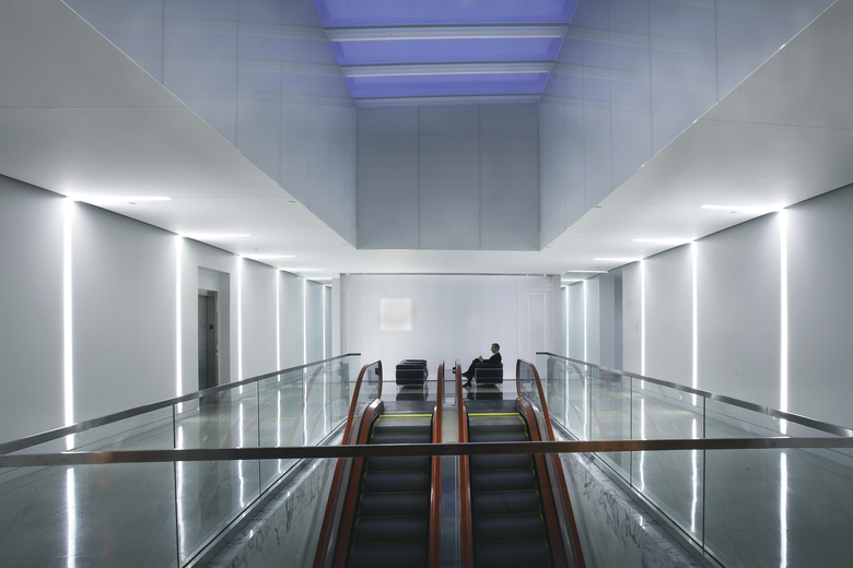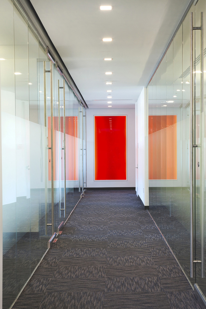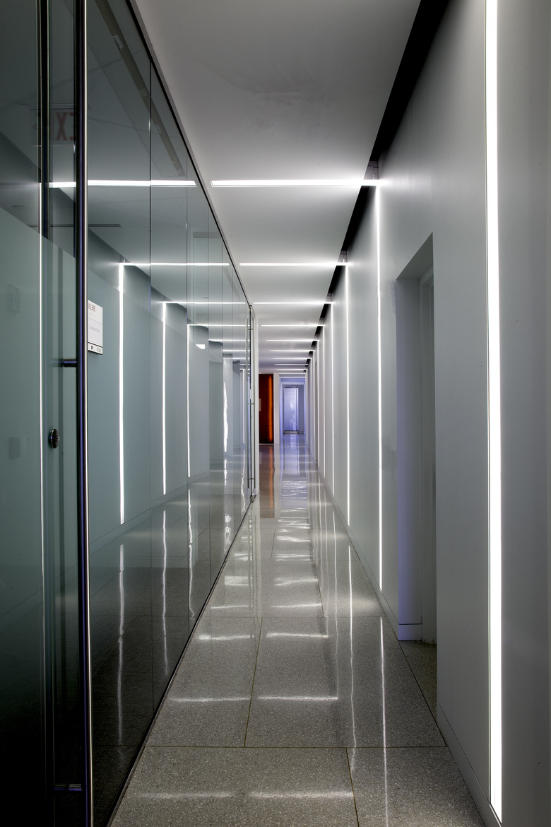 The interior renovation of the Swiss-based Schindler Elevator Corporation transforms an existing mundane 1970’s office building into a distinctive U.S. Headquarters. Schindler’s objective was to create an interior environment that expressed the minimal and purist design aesthetics of its Swiss engineering heritage. Schindler’s corporate mission is to safely move millions of people each day with their elevators and escalators throughout the world. Inspired by contemporary artists working with light and color to illustrate space and movement, our design creates a series of one point perspective ‘mise en scènes’ that abstractly explore movement and displacement. Simple fluorescent lights aches and red Swiss-flag colored surfaces create an unadorned environment of light and color that is dynamic and minimal. Precise trim-less detailing conveys the highly engineered heritage of the Corporation. Program spaces, such as, the conference room, training center, and the corporate dining room are designed as art installations that employees and visitors walk through and experience as three dimensional constructs of movement and displacement. The renovation employs a series of sustainable design measures to reduce energy consumption including: photo optic lighting controls, LED lighting fixtures, recyclable carpet tiles, low-e insulating replacement windows, roof mounted photovoltaic cells and low water consumption bathroom fixtures.