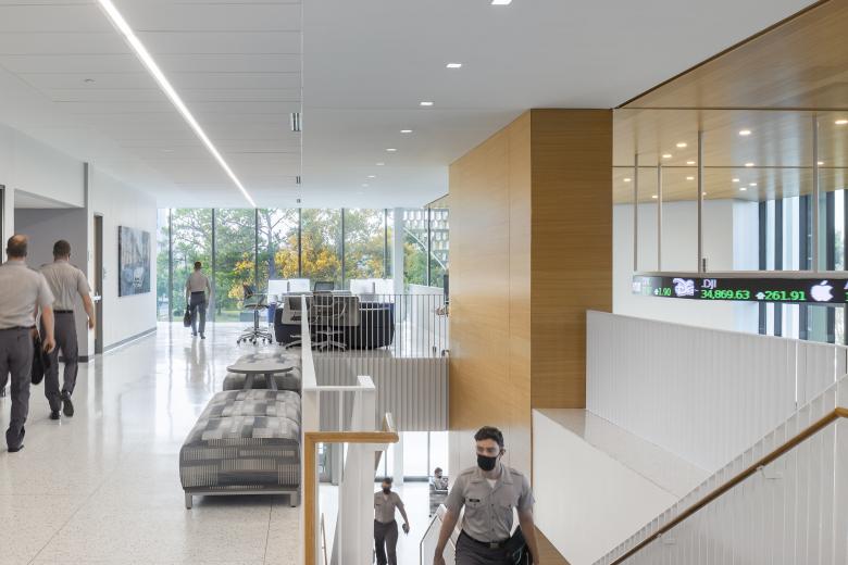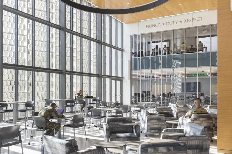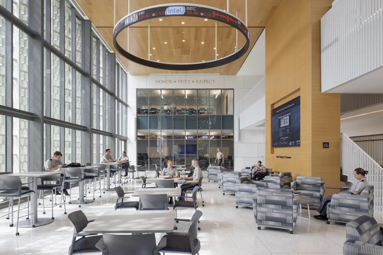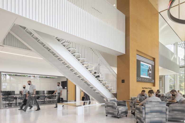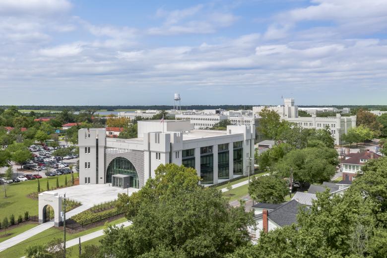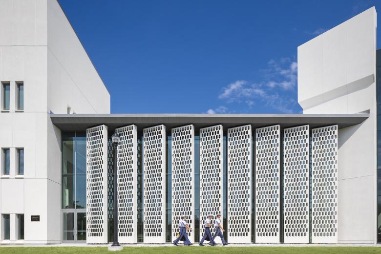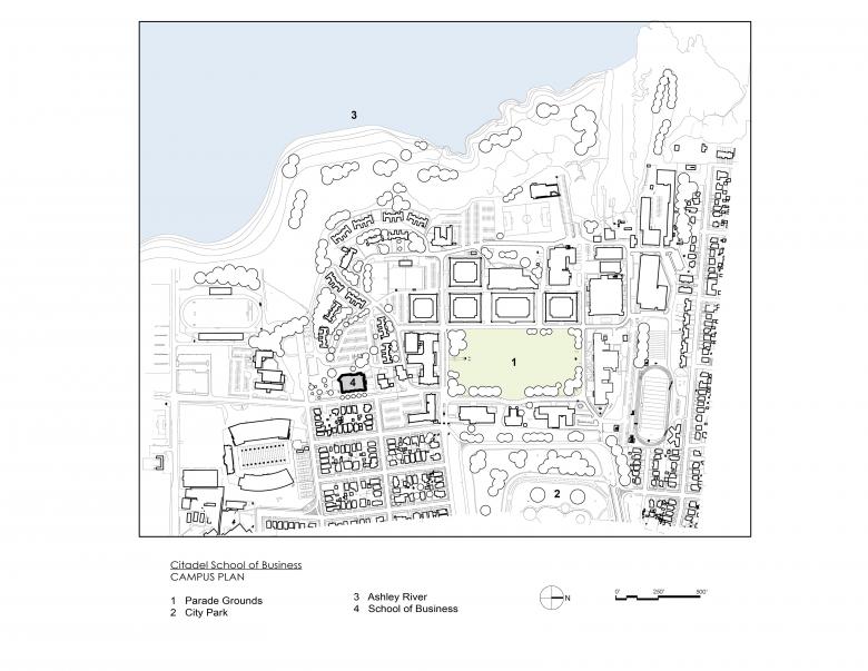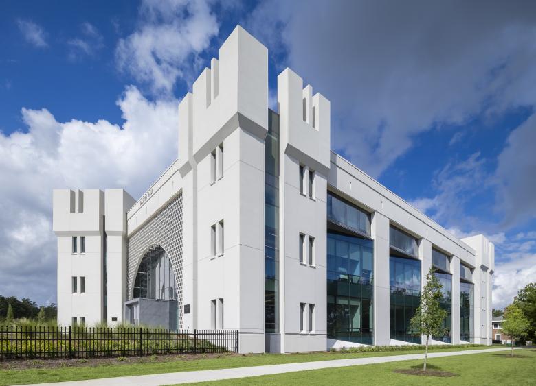 Sited on the edge of campus at The Citadel, the Military College of South Carolina, the 45,000-square-foot School of Business acts as a gateway to the college, and serves as an ambassador to Charleston’s business community. The building is a contemporary interpretation of their historic campus, distinctly open and transparent, conveying a welcoming gesture to the City in contrast to the historic fortress-like buildings of the adjacent campus. The new building utilizes forms, shapes, and materials that recall the heritage of its iconic campus. A light and welcoming arch-motif entry and perforated metal solar screens are used to convey a sense of forward-looking openness that will present the School of Business as a new front door to the campus. Organized around a multi-story flexible business commons, the building is composed of interactive classrooms, a financial services lab, a sales classroom, and several flat flexible classrooms, all supported by breakout rooms, faculty offices, and student support facilities. The building incorporates a sustainable approach and achieved 2 Green Globes certification. The project was completed by Liollio Architecture in association with ikon.5 architects.