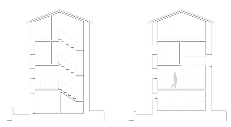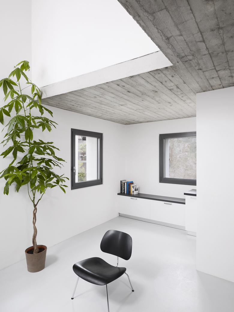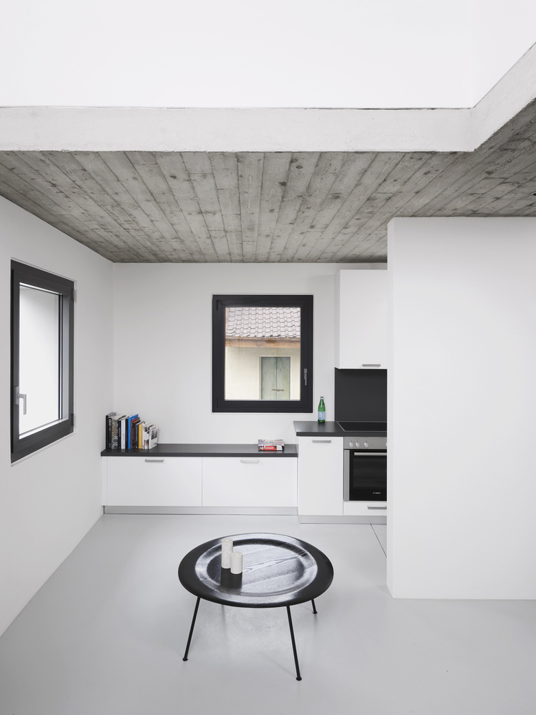 The project wants to underline the historical background of the building on the outside while on the inside the intention is to give people the perception of a bigger space then the bare 30 square meter on each floor: The windows are flushed with the inner surface of the 50 cm wall structure (to increase the perception of the old walls from outside).