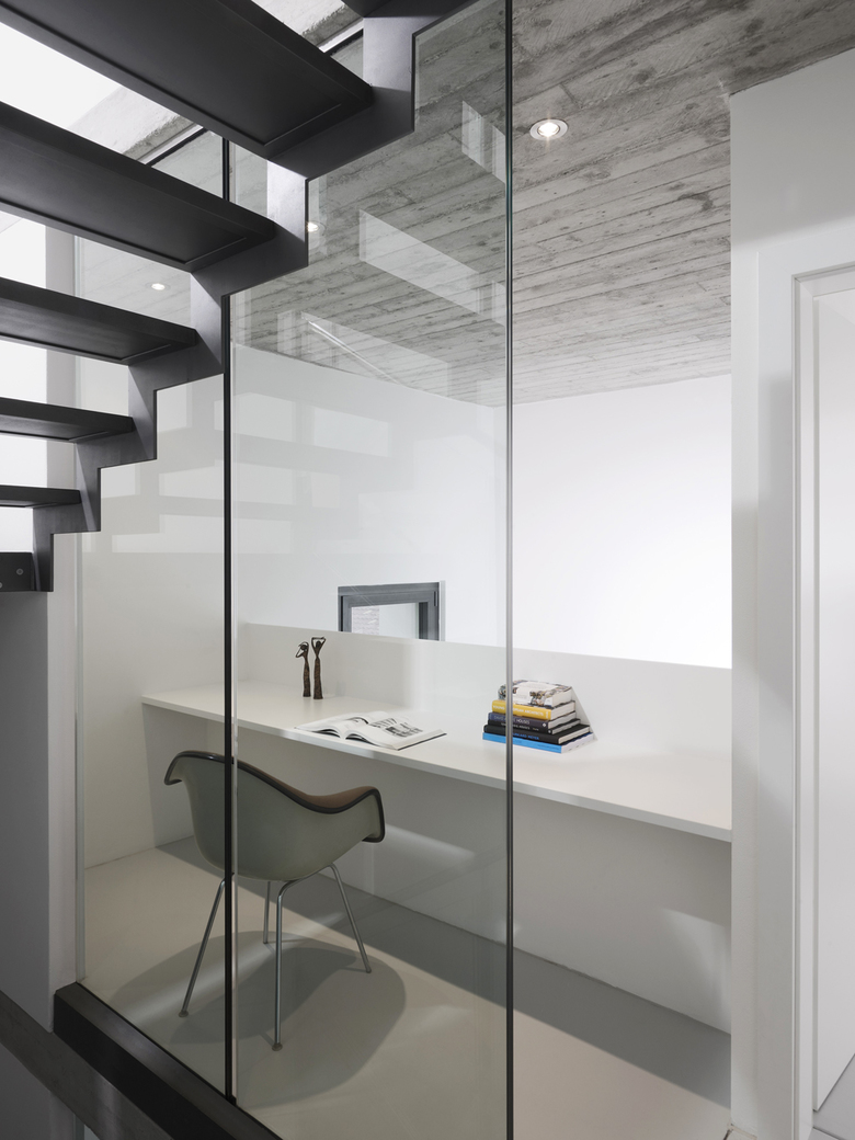 The lightweight metal stairs is visible from all spaces which yearn for a visual relationship with eachother.