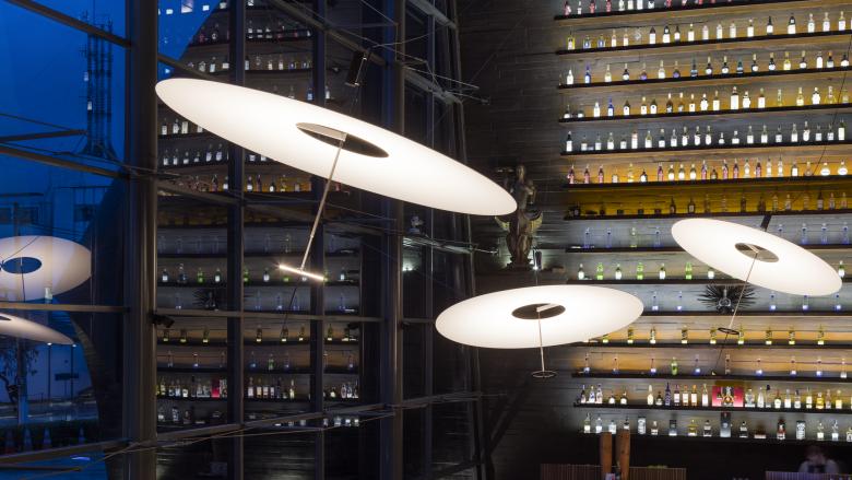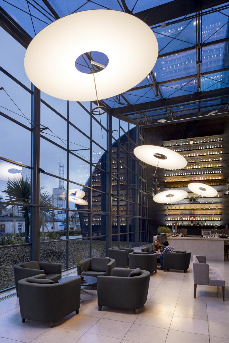 Im Hotel Unique in Sao Paulo platzierten Ingo Maurer und sein Team fünf Flying Disc über Lobby und Bar. Der bestehende Raum wurde dadurch aufgewertet. Das Arrangement lenkt die Aufmerksamkeit der Besucher vom Sitzbereich in der Mitte der Lobby bis zum Ende des Raumes, der vorher nur wenige Gäste anzog. Das völlig blendfreien Licht bietet den Hotelgästen eine entspannenden Atmosphäre, in der sie die Räumlichkeiten genießen können. Während der Installation war Ingo Maurer und Team im Hotel Unique anwesend und leitete die Platzierung der Lichtobjekte.