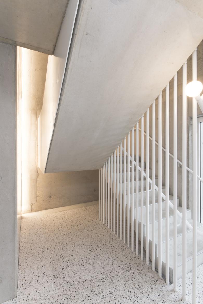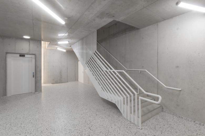 Die optisch zweigeschossige Arkadenzone verleiht dem Gebäude eine harmonische Proportion und bildet mit ihrem fußgängerfreundlichen Charakter und der Einbindung des Fitness-Studios ein Pendant zum gegenüberliegenden Supermarkt.