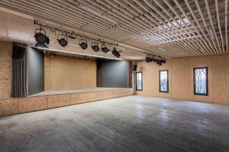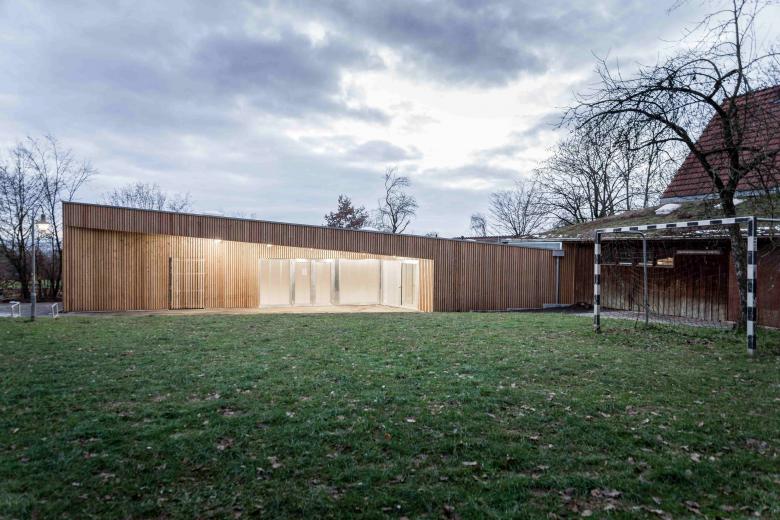 In bester Tradition des Hauptbaus von Peter Hübner entstand ein Ersatzbau für die marode Veranstaltungshalle des Jugendzentrums Zinsholz in Ostfildern. Der neue, klare Baukörper in Holzrahmenbauweise steht auf dem Bestandsfundament. Die Konstruktion beschränkt sich auf das Nötigste und entwickelt ihre Ästhetik aus dem offenen und naturgemäßen Einsatz der verwendeten Materialien: OSB und Lärchenlatten, blankes Aluminium und roher Estrich.