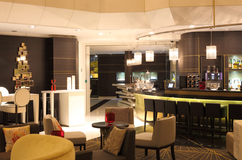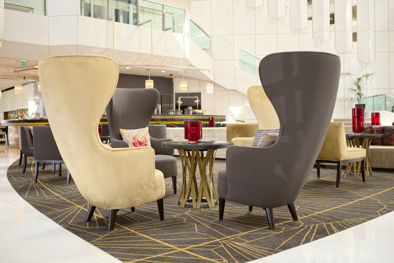 Beeindruckend, imposant, regelrecht erhebend wirkt die mehrere Geschosse übergreifende Hotelhalle mit ihrer sakralen Architektur. Doch ein Gefühl der Erdrückung kommt keineswegs auf. Eine aufwendige Lichtinstallation, die aus über 1.600 filigranen blätterartigen goldenen Plättchen besteht und sich über eine Höhe von 22 Metern erstreckt, bricht das konzertsaalartige auf menschliche Dimensionen herunter. Edler weißer Marmor an den Wänden und auf dem Boden erzeugt in Kombination schwarzen, goldenen und braunen Elementen Leichtigkeit und Wärme, wodurch das Kantige und Gewaltige des Empfangsbereichs in den Hintergrund gerät. Eine offene Bar mit einer Vielzahl an Sitzmöglichkeiten – ob zum Entspannen in einem der modernen Ohrensessel oder für einen Cocktail an dem in Gold lackierten organisch geschwungenen Tresen – ist Anziehungspunkt zu allen Tages- und Nachtzeiten, um am Hot Spot von Cannes teilzuhaben oder einen Blick auf berühmte Stars und Sternchen zu werfen. Und das nicht nur zu Zeiten des berühmten Filmfestivals.