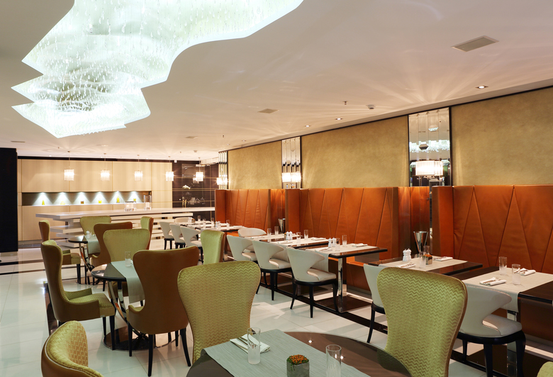 Bei der Umgestaltung des Restaurants lag eine Herausforderung darin, den Gästen von der Lobby den Weg in das Restaurant zu weisen und dadurch die Sichtbarkeit zu verbessern. Die Lösung lag in der Gestaltung und Platzierung des „Communal Table“ – ein zentrales Element im Markenkonzept. Es ist eine exklusive Anfertigung aus weißen Marmorplatten, die wie zufällig geschichtet eine moderne Tafel ergeben. Positioniert am Ende des Bartresens und dadurch noch von der Lobby aus sichtbar, führt sie direkt in das Restaurant. Hier steht Genuss pur – für Gaumen und Augen – auf dem Programm. Eine faszinierende Lichtskulptur, hochwertigste Materialien wie rostbraunes Leder mit feinen abgesteppten Nähten, dunkelgoldener Polsterstoff, weiße Lederstühle mit einer handgearbeiteten Nietenkante und erneut der weiße Marmor für den Boden, hier durch Schwarzen unterbrochen, führen das Designkonzept fort.