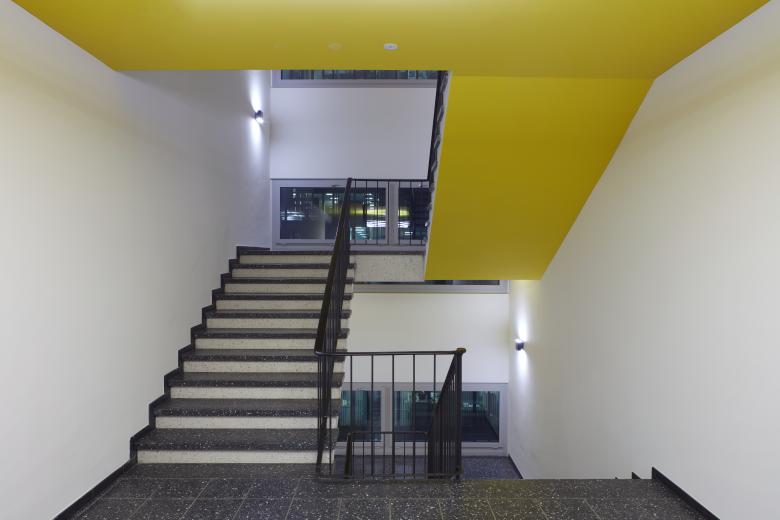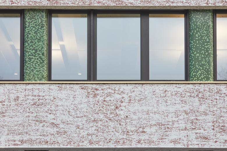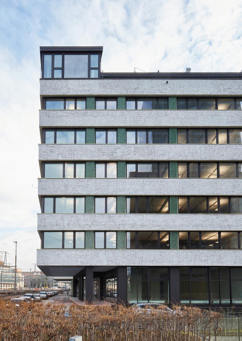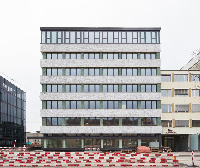 Das Geschäftshaus aus dem Jahre 1962 wurde erneuert, damit es den heutigen Anforderungen bezüglich Raumnutzung und Energieverbrauch entsprechen kann. Das für die Fassade prägende Brüstungsband bleibt erhalten, die Dämmstärke von 4 cm auf 22 cm erhöht. Das Fensterband mit den Stützenverkleidungen aus Faserzement wird neu interpretiert. Die Fenstereinteilung wird vereinfacht, damit die Raumgrössen im Innern flexibler unterteilt werden können. Ein neues Attikageschoss kann zusätzliche Büronutzungen aufnehmen.