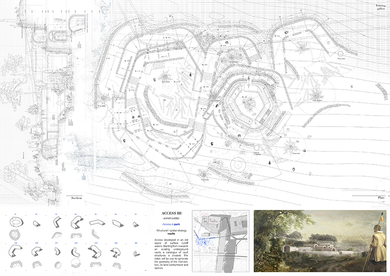 The project starts from an historical and cartographic research, drawing and analyzing the net of underground galleries that belongs to Madrid. The main infrastructures that are considered in the analysis are the medieval that constitute the origin of the city. The general strategy comes from a definite desire, to recover that lost landscape. After research it is decided to intervene in the historical downtown of Madrid. A Plan of Recovery of the antique spaces is created setting the main principles. These principles are to recover part of the existing galleries, to generate new connections and to propose interventions making new access and new spaces. The plan entails a recovery of the existing underground spaces in addition to the new access turning them into public space. New urban scenes will be set reflecting a lost reality. Three interventions will be developed completely. The access will be developed in detail attending to their typology (park, square or existing building). Each intervention will be defined in agreement to its spatial strategy (arcs, vaults or folded retaining walls). Those structural geometries will define the spaces qualities as well, in a tectonic way. All these forms are shaped according to the stress experienced by the materials. That development is made using structural analysis 3D software. A review of the old Roman technics is set using a new structural approach developing the geometries of the interventions and the spaces in a holistic way. Contemporary technified vaults that remain ancient Roman technique. P.R.U.S of Madrid is a Plan that offers continuity to the territory and the city using architectonic resources. The thrill of the project remains in its role as a palimpsest, recovering abandoned connections, operating on existing spaces and making up urban scenes from what there was and what there will be.