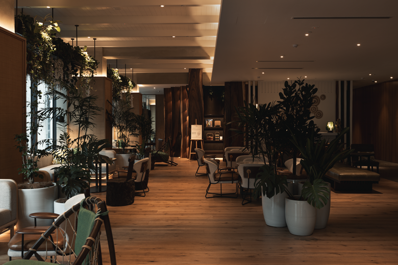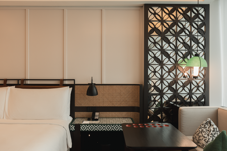 Die Innenräume wurden unter Berücksichtigung der kulturellen Vielfalt Malaysias gestaltet. Möbel, Oberflächen und Details greifen typische Motive und Materialien der Region auf, ohne dabei übermäßig dekorativ zu wirken. Die Lobby, deren Empfangstresen aus verwittertem Wurzelholz besteht, ist als großzügiger Eingangsraum mit einem begrünten Wandmodul angelegt. Recycelte Materialien wie Glasflaschen und Altmetall wurden gezielt eingesetzt. Auch die Haupttreppe wurde aus alten Bahnschwellen gefertigt. Die Verbindung von Rohmaterial und sorgfältiger Verarbeitung zieht sich durch alle öffentlichen Bereiche. Auf dem Dach wurde ein offener Ruhebereich mit Pool gestaltet. Eine geometrisch strukturierte Metallkonstruktion filtert das Licht. Begrünte Flächen, eingelassene Pflanztröge und natürliche Materialien ergänzen das Konzept, wodurch die Gestaltung einer klaren Ordnung folgt, ohne aufgesetzt zu wirken.