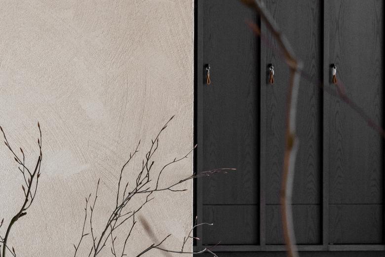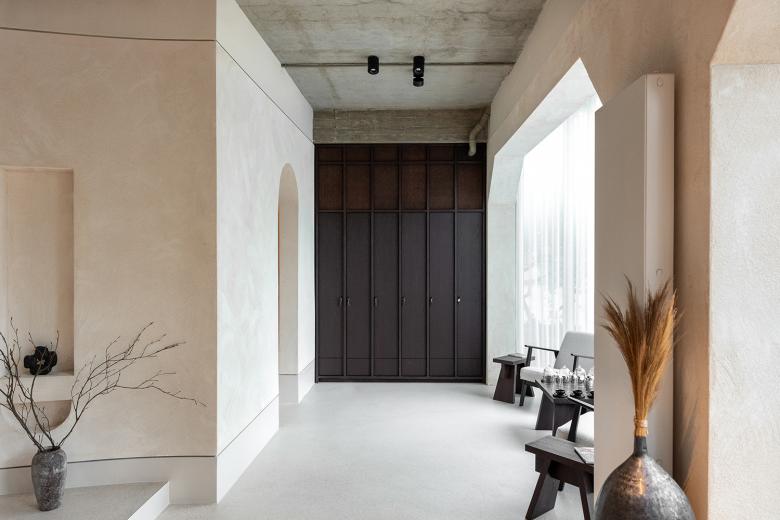 Die Gestaltung basiert auf einem fein abgestimmten Material- und Farbkonzept: Helle Putzflächen treffen auf terrazzoartige Böden, dunkles Holz und schwarze Akzente. In den Behandlungsräumen sorgt eine reduzierte Formensprache für eine beruhigende Atmosphäre. Bogenförmige Wandöffnungen und fließende Raumfolgen betonen das Gefühl von Geborgenheit und Rückzug. Das Zusammenspiel aus natürlichen Texturen und handwerklich veredelten Oberflächen erzeugt eine haptische Wärme. Dunkles Holz, graphitschwarze Details und textile Elemente bilden Kontraste zu den hellen, mineralischen Flächen. Eine präzise Lichtführung akzentuiert die Raumeindrücke – mal indirekt, mal fokussiert.
