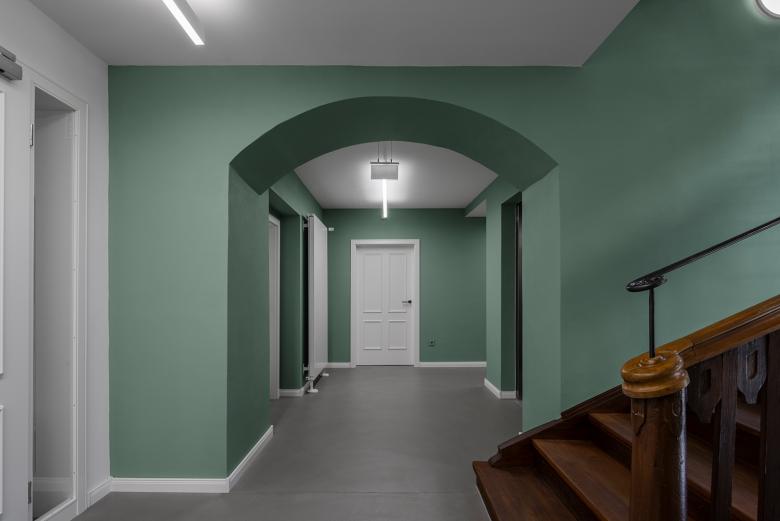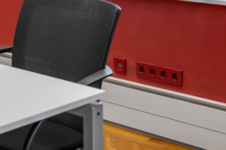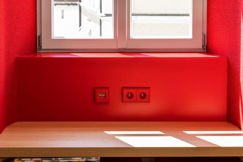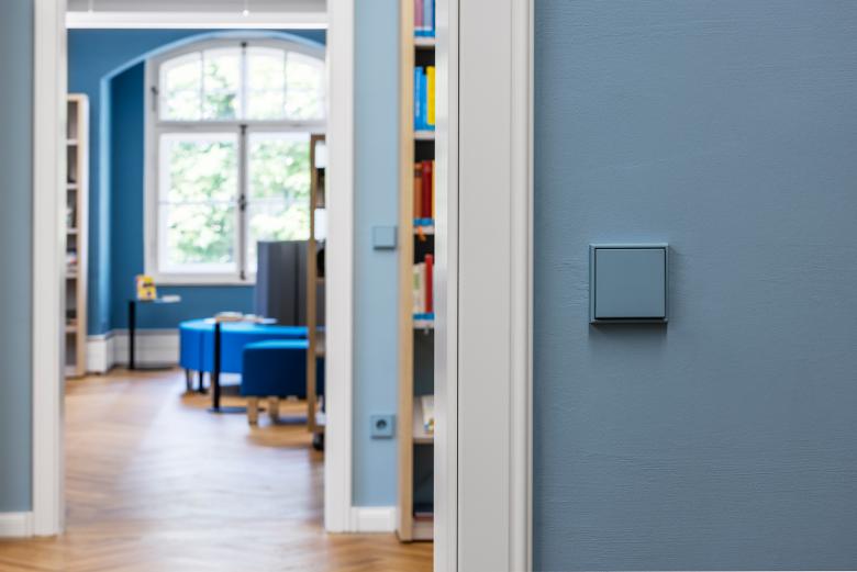 Im Mittelpunkt der Gestaltung steht das neue Farbkonzept. Die Planer/innen entwickelten auf Basis der NCS (Natural Colour System) Farbpalette eine fein abgestimmte Farbwelt, die natürliche Materialien wie Eiche und Putz mit Akzenten in Rot, Blau und Grün kombiniert. Die Töne greifen historische Bezüge auf und übersetzen sie in eine zeitgemäße, klare Farbsprache. Die JUNG Produkte ergänzen das Konzept mit den passenden Les Couleurs® Le Corbusier® Farbtönen und setzen es bis ins Detail fort. Zum Einsatz kamen Flächenschalter, Steckdosen, USB-Steckdosen und Anschlussdosen aus dem Programm LS 990 sowie F50 Taster. Verwendet wurden unter anderem die Farbtöne vert anglais clair (LC 32041) als ein heller, elegant zurückhaltender Grünton, vert anglais (LC 32040) als natürliches Grün, céruléen vif (LC 32031) und céruléen moyen (LC 32032) als klare, lebendige Blautöne, rouge vermillon 31 (LC 32090) als kraftvoller, leuchtender Rotton sowie l’ocre rouge moyen (LC 32111), ein warmer, erdiger Ockerton.