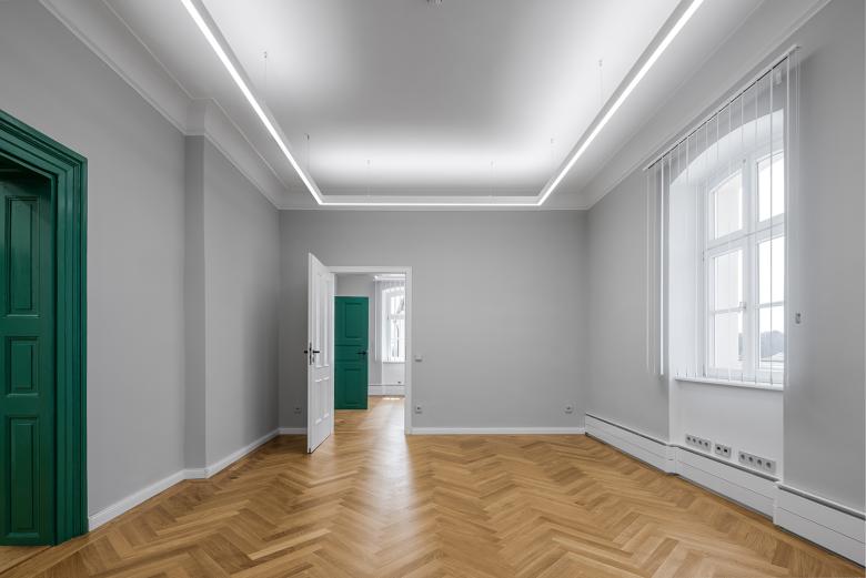 Die Sanierung durch PH2 Architektur + Stadtplanung basierte auf dem klaren Leitgedanken einer behutsamen Erneuerung bei größtmöglicher Erhaltung historischer Substanz. Türen, Fenster und Stuckdecken wurden restauriert, das Mauerwerk trockengelegt sowie Dach und Fassade denkmalgerecht instandgesetzt. Gleichzeitig erhielt das Gebäude eine moderne, barrierefreie Erschließung und eine zeitgemäße technische Ausstattung, vom Aufzug über die Elektroinstallation bis zur digitalen Bibliothekstechnik.