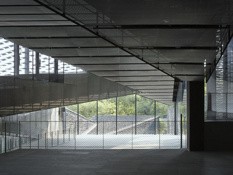 Roof tiles used to cover old homes in the area were gathered, and these and various other locally available materials with rich textures such as cedar were used inside. The group of small roofs that were made using these tiles give the museum the appearance of a village. The tiles are held in place with stainless steel wire to create a screen which controls the light and view, and a façade that has a rich variation of shadows. This methodology proposes the idea that rather than the gardens being in contrast with the architecture, the soil from the tea gardens is gradually transformed into the man-made architecture.