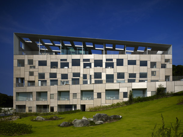 As for the ‘made of wood’ aspect, we did not interpret that to simply mean using lots of wood for the exterior and interior of the building. Because trees are naturally much smaller than these large buildings, a huge gap in scale exists between the two forms, making it difficult to achieve the idea of ‘made of wood.’ To solve the problem we created wooden panels sized midway between a tree and the volume of the building. This worked well to create a sense that the buildings are ‘made of’ wood.