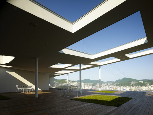 In the main hall (the largest space), two of the walls are inflected at the top so that they transform into the roof. The area under the roof is resolved as a void filled with thin pillars and small glass boxes, rather than as a solid. Its ‘roof-ness’ is therefore emphasized, as is the dual role of the box/roof.