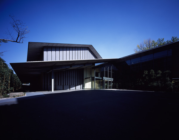 We wanted to link the new museum naturally with its surroundings via the shade cast by its gently sloping roof, which runs between the busy commercial area and the woods. The tiled roof with its low eaves maintains the original image of the museum while also harmonizing the new building with the garden; the linear element merges with the woods behind it. By lining the roof’s lower edge with a steel plate treated with weak phosphoric acid, we were able to eliminate the theme-park-like sense of unreality the tiles tend to have, and better match their appearance with the refined works of art displayed in the museum. Phosphoric acid was also applied to the steel panels in the exterior wall, as the material can assimilate to the shade.