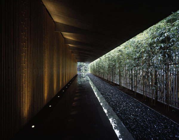 The building is not fenced off from the city. Rather, in an attempt to integrate the museum into the urban landscape, it remains open to the street through a bamboo thicket. People walk alongside the bamboo under the museum’s deep eaves, passing from the lively town to the beautiful forest. Like guests who walk down the traditional ‘roji’ path leading to a tea room, visitors to the museum change their mood as they follow this path, which ends the flow from Meiji Shrine down Omotesando.