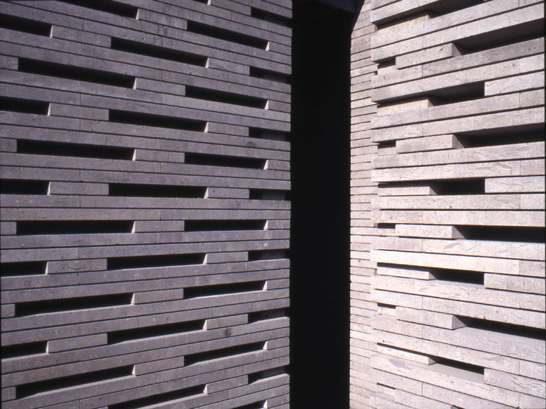 Ashino stone, the same type of stone used to build the warehouses, was utilized for the new details that were added to join the areas together. Two types of design features were incorporated to create a unique lighting effect on the inside, consisting of horizontal stone louvers and porous masonry with approximately one third of the pieces removed.