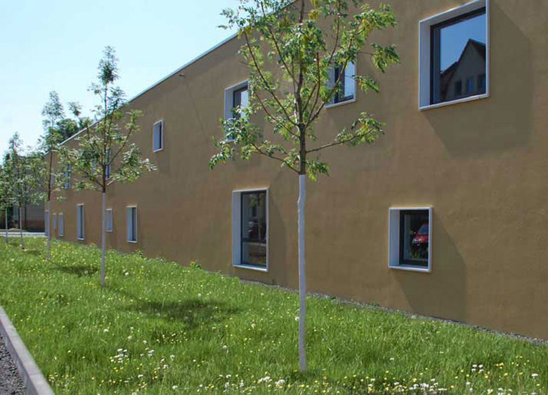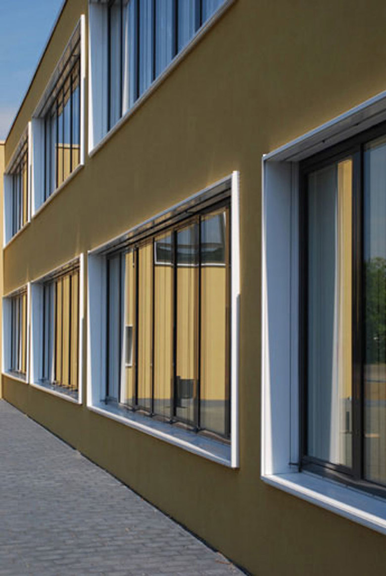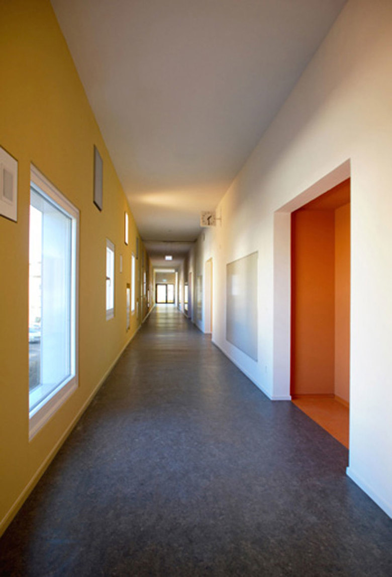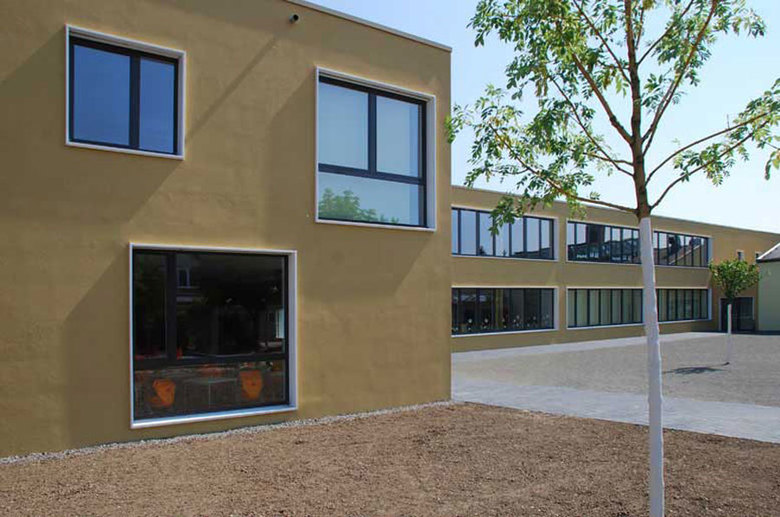 Der geometrisch einfache Baukörper weist großzügige Klassenraumfenster nach Süd- Westen auf, in den übrigen Bereichen zeigt in den Fassade spielerische Elemente, die in den Innenbereichen durch Heizkörpernischen, Leuchten, Pinnwände u.a. aufgegriffen werden und das spielerische Element einer Grundschule zur Geltung bringen.