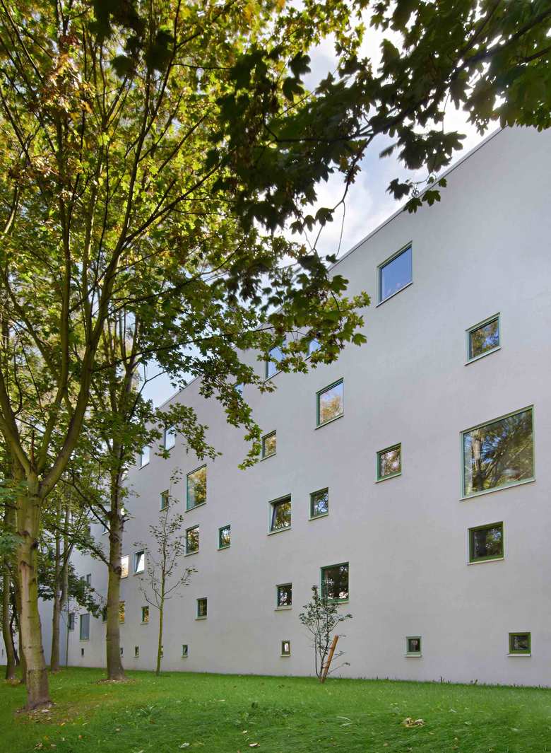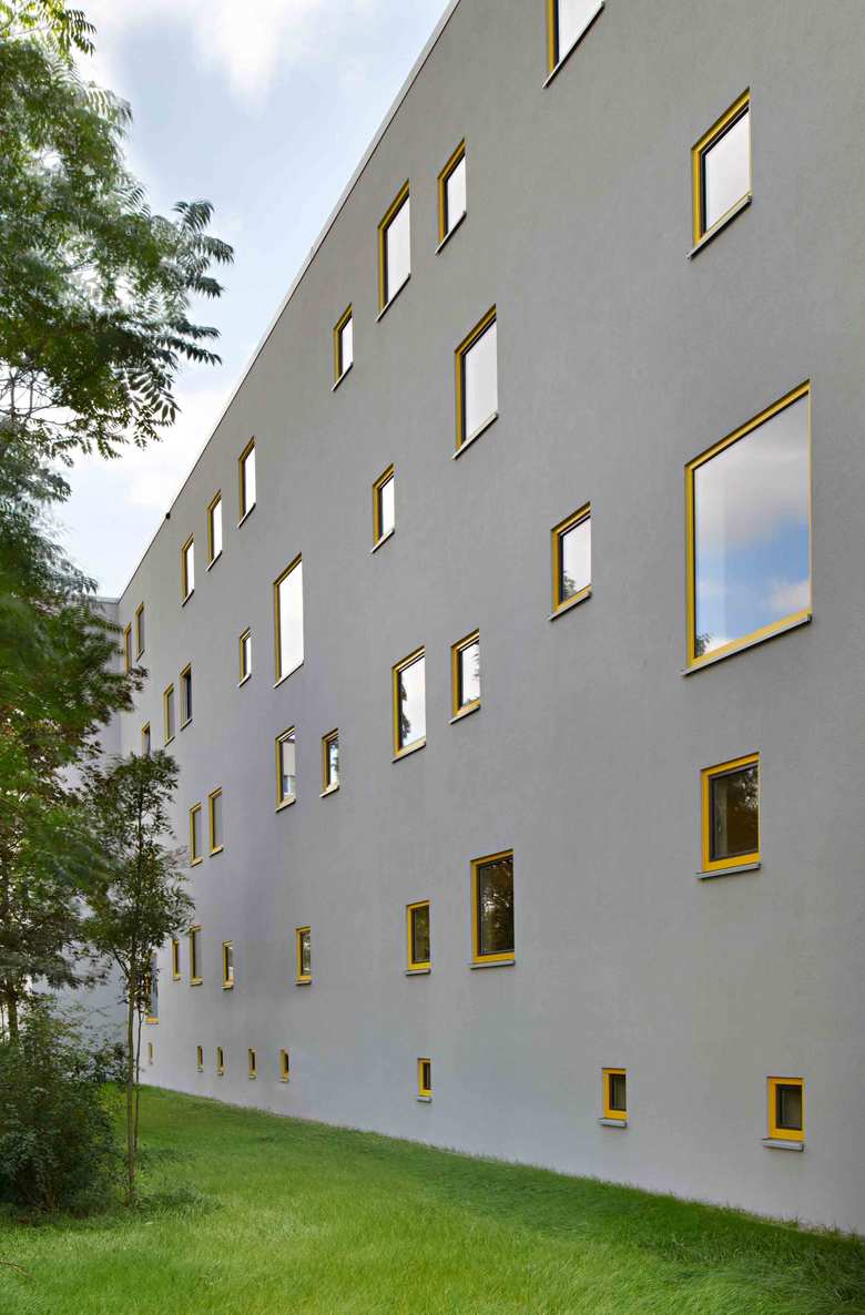 Anlass für die Fassadenplanung ist die erforderliche thermische Sanierung der äußeren Hülle, Zielstellung ist die Unterschreitung der Vorgaben der EnEV 2007 um 30%. Um mit dem besseren Wärmeschutz gleichzeitig auch eine prägnantere Gestaltung zu erzielen, werden die bisherigen Fensterbänder der Flure auf der Nordseite teilweise ausgemauert, es entsteht eine Lochfassade mit quadratischen Einzelfenstern unterschiedlicher Größe in unregelmäßiger Anordnung. Die Fassaden auf der Nord- Ost- und Westseite werden zum flächigen Mantel des Gebäudes, das sich jetzt eindeutig nach Süden orientiert. Die Fenster auf der Südseite erhalten unregelmäßig angeordnete Vertikalteilungen, so dass auch hier der strenge Baukörper durch ein spielerisch – unregelmäßiges Element überlagert wird, ohne dabei gestalterisch beliebig zu werden.