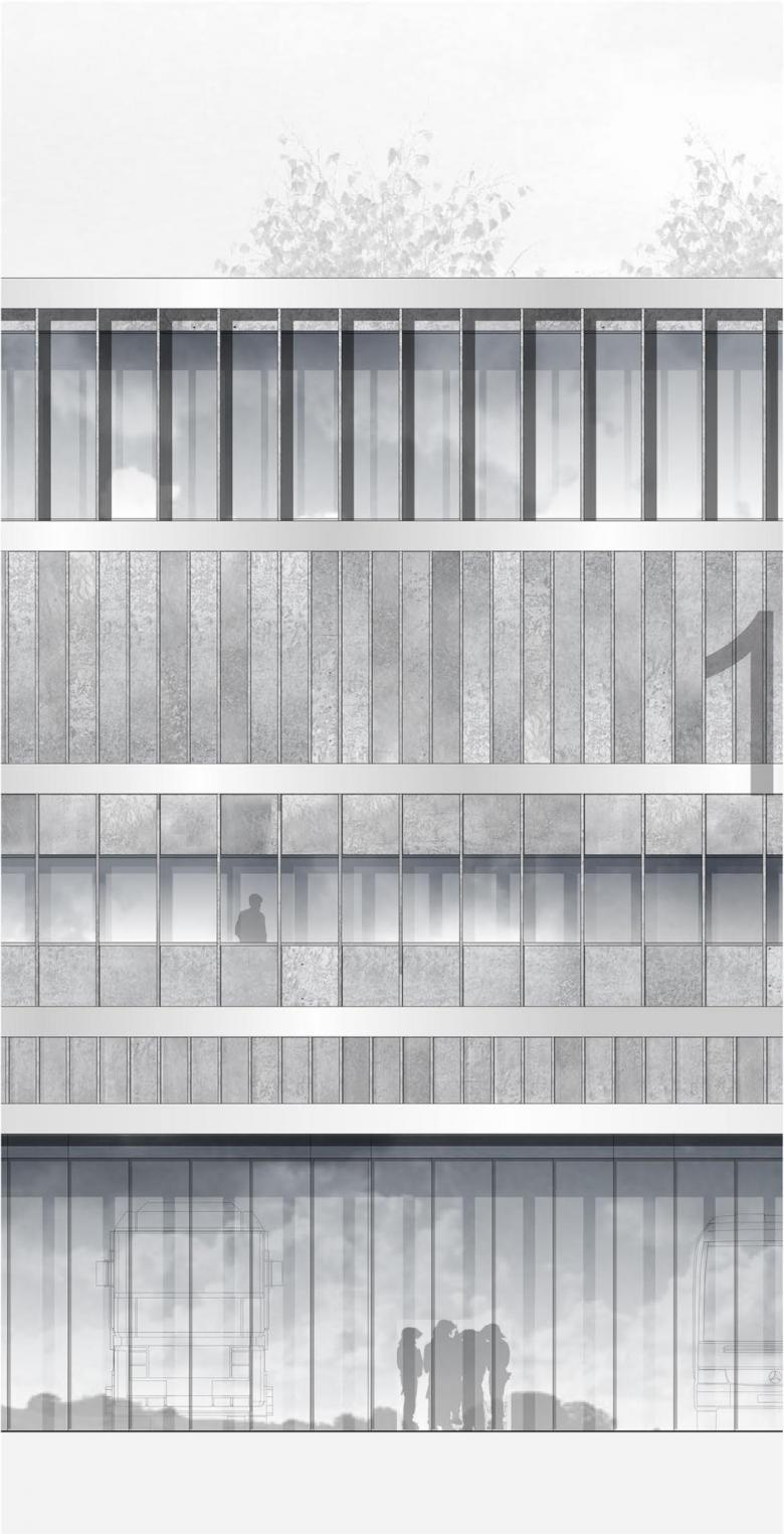 Wesentliches Gestaltungsmerkmal der Fassade sind die geschossweise in unterschiedlichen Achsabständen montierten, vertikalen Lisenen. Dabei handelt es sich um eloxierte Aluminium-Rechteckprofile, die jeweils auf Höhe der Geschossdecken abgesetzt sind und die Geschosse des Baukörpers abbilden. Zwischen diesen Lisenen wurden die Fassadentafeln montiert.
