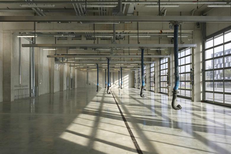 So konnte eine Fassade realisiert werden, in der die herstellungsbedingten Oberflächen der verzinkten Stahlblechtafeln kompromisslos in die Fassadengestaltung übernommen wurde.
