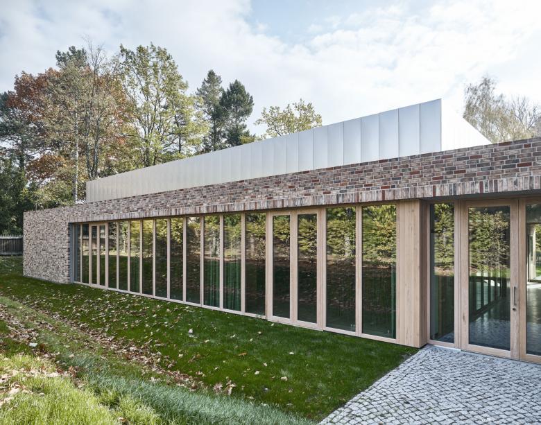 Der eingeschossige Baukörper wird als neuer Baustein zwischen einem Gartendenkmal, der Kirche sowie den bestehenden Pfarrhäusern an der Karl– May– Straße eingefügt. Der Neubau bindet in die bestehende Topographie ein, tritt als Volumen zurück und lässt der Lutherkirche ihre Wirkung als Solitär.