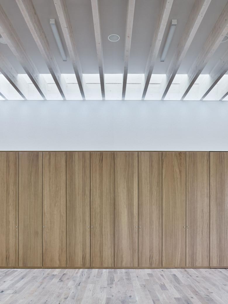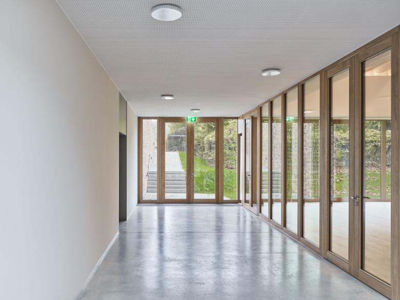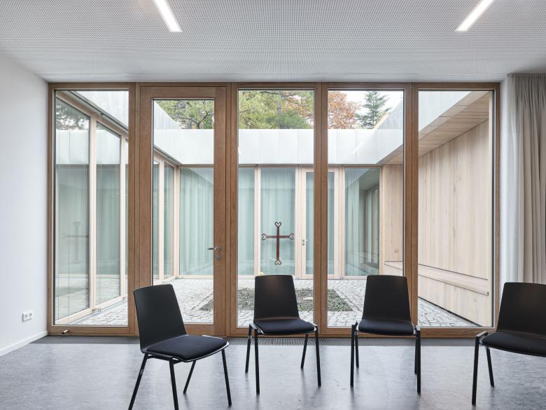 Das Foyer des Neubaus verbindet als Knotenpunkt die Innen- und Außenraumbezüge von Neubau und Bestand. Der Gemeindesaal und der angeschlossene Gemeinderaum werden über das zweiseitig zugängliche Foyer erschlossen und orientieren sich mit der Längsseite in den ruhigen Norden auf das Gartendenkmal des Ehrenhains. Die südlich davon gelegenen Räume orientieren sich auf einen umschlossenen Innenhof. Dieser Innenhof bildet eine besondere Charakteristik als Außenraum für ruhige Momente.