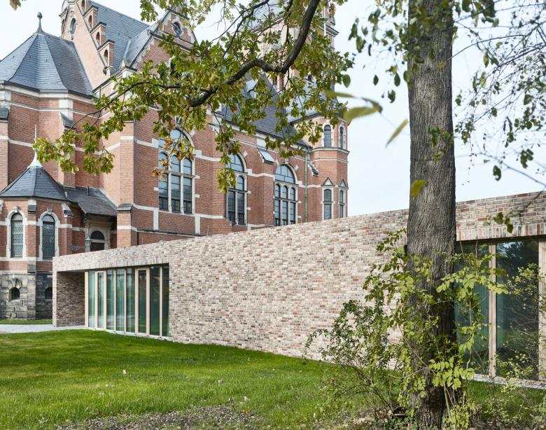 Die Außenwände werden mit Kerndämmung und Verblendmauerwerk versehen, dessen Farbmischung Bezüge zu den Steinfarben der Kirche aufnimmt. Dabei sollte der Neubau nicht die monochrome Ziegelfarbe der Kirche aufnehmen, sondern eine Mischung aus den Ziegelwänden und den Natursteinelementen des Sockels erzeugen. Realisiert wurde dies durch eine bewusst heterogene Mischung, deren rote Grundfärbung von vielerlei Farbabstufungen der Nachbarbebauung in unregelmäßiger Anordnung ergänzt wird.