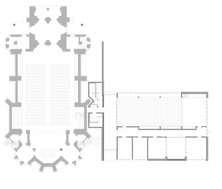 Die Anbindung des Kirchengebäudes erfolgt über einen Durchgang im Sockelgeschoss der Kirche, in der Kirche wird unter der Empore ein Treppen- und Liftaufgang mit einer Glasabtrennung eingebaut. Diese erdüberdeckte Anbindung fügt sich in die Erschließungs- und Funktionsstruktur des Gesamtensembles ein und erfüllt zudem die Forderung der Denkmalbehörden zum Erhalt des Rundweges um die Kirche.