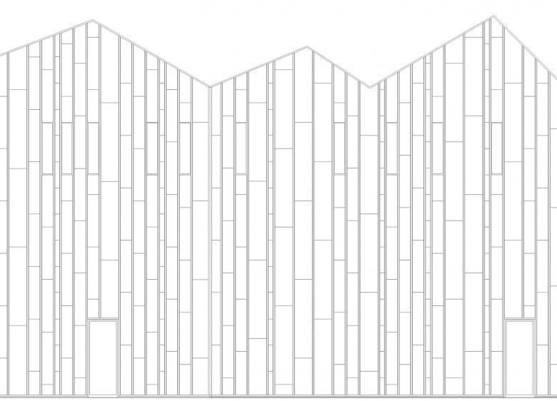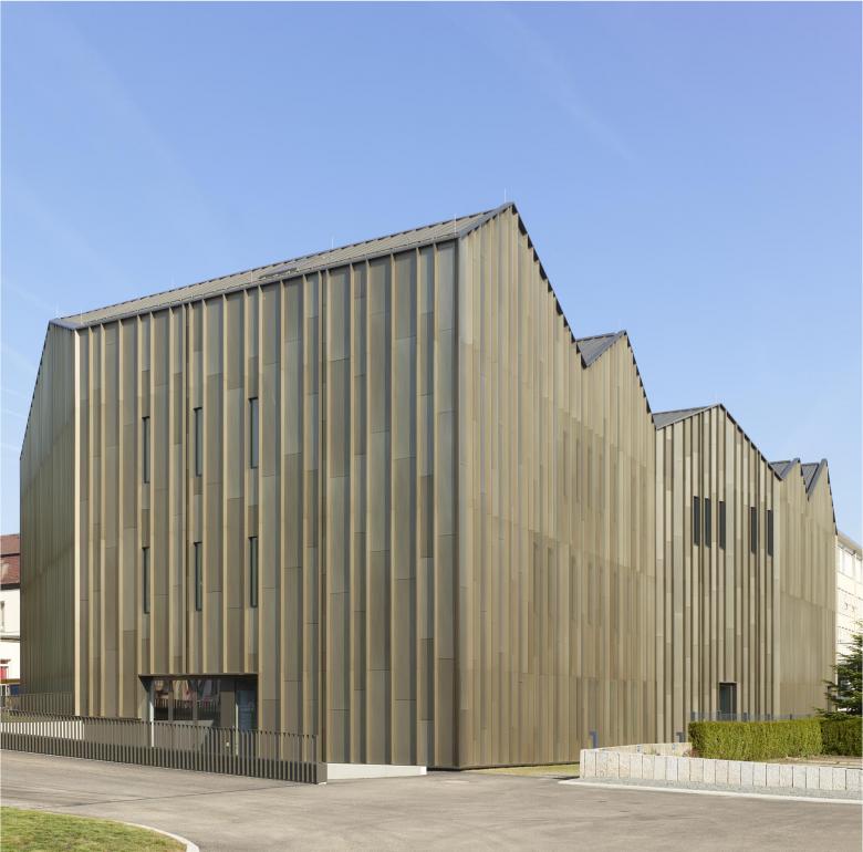 FASSADEN – Gestalterisches Ziel war es, in der weitgehend geschlossenen Metallfassade eine kleinteilige Oberflächenstruktur zu erzeugen, die eine ungegliederte Flächigkeit konsequent vermeidet. Die hinterlüftete Fassade setzt sich daher aus Blechen zusammen, die in vertikalen Streifen unterschiedlicher Breite angeordnet sind und durch hervortretende Unterkonstruktionslisenen strukturiert werden. Dies erzeugt zusammen mit der geknickten Grundrisstruktur je nach Sonnenstand und Betrachtungswinkel unterschiedliche Tiefe.