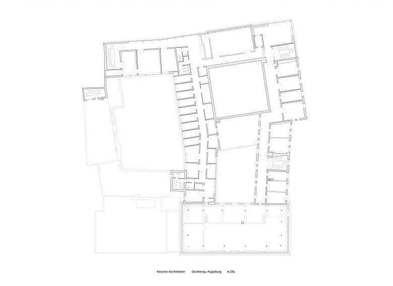 Betreten werden die unterschiedlichen Institutionen über die tagsüber geöffneten Höfe, die ein Durchwandern des Komplexes von der Hauptstadtachse Grottenau bis zur Kleinen Grottenau in Richtung Stadtbibliothek und Stadtmarkt ermöglichen. Über getrennte vertikale Erschließungen werden Besucher und Besucherinnen zielgerichtet zu den etwaigen Anlaufstellen verteilt: Im ersten und zweiten Obergeschoss befinden sich Büroflächen für die städtischen Ämter, in den zwei darüber liegenden Geschossen sind die Nutzflächen der Musikhochschule untergebracht. Hierbei wurde die historische Raumstruktur für Büros und Seminarräume weitestgehend erhalten und durch die Aufstockung mit großmaßstäblicheren Nutzungseinheiten wie Probebühnen und Studios ergänzt.