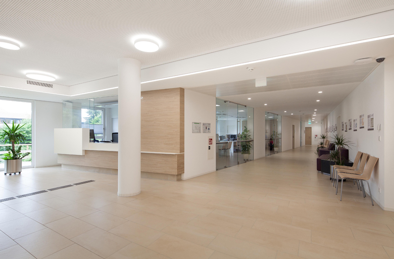 Die Büros sind auf einem Raster aufgebaut, um gleichwohl flächeneffiziente und flexible, wie gute Raumproportionen der Einzel- und Doppelbüros zu erhalten. Glasschlitze in den Gangwänden sollen die informelle Kommunikation und das Bestreben nach Transparenz und Offenheit in einem öffentlichen Gebäude fördern und zudem die Möglichkeit einer indirekten Belichtung der Flurzone bieten. Um dem Bedarf nach Sicherheit nachzukommen erhalten die Büros verbindendende Innentüren.