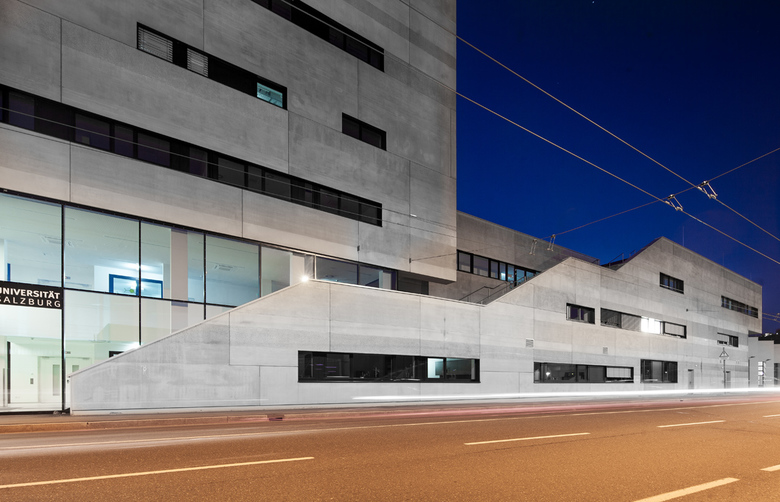 Die Haupterschließung erfolgt von der Jakob-Haringer-Straße im Norden über einen großzügigen, überdachten Eingangsvorplatz, der sich über die Schillerstraße hinweg zu einem attraktiven öffentlichen Raum ausweitet und eine Verbindung zum angrenzenden Lehrgebäude der Uni Salzburg eingeht.