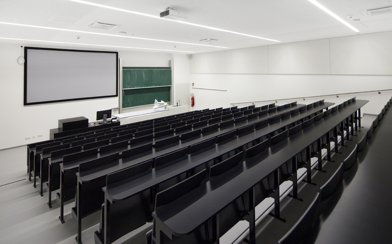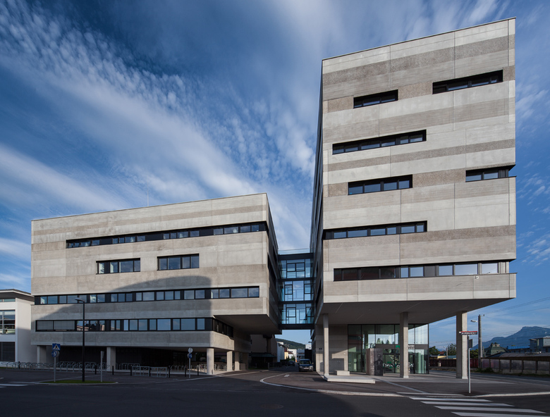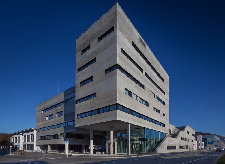 Die Fassade wird in Sichtbeton aus Sandwich-Fassadenelementen errichtet. Vier verschiedene, horizontal angeordnete Muster-Platten verleihen der Betonhülle ein abwechslungsreiches Licht- und Schattenspiel. Die beiden Universitätsgebäude wirken nun zur angrenzenden Bebauung wie ein Ruhepol.