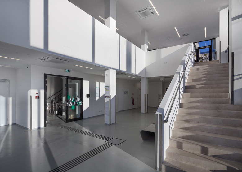 Das Innere des Forschungs-/Lehrgebäudes zeigt sich von seiner nüchternen Seite - neutrale Weiß- und helle Grautöne geben vorwiegend den Ton an. An der Decke hingegen sichtbar installiert sitzen die unterschiedlichsten Gerätschaften und verlaufen zahlreiche Leitungsrohre, aus dem Thema Sicherheit und um jederzeit manuell in die Regelsteuerung eingreifen zu können.