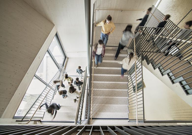 Offenen Lernzonen in der Raumschicht bilden zusammen mit den klassischen Unterrichtsräumen im Bestand ein pädagogisches Gesamtkonzept.