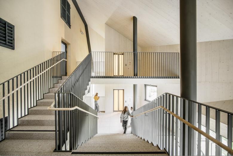 Der ursprüngliche Gedanke eines Funktionsbaus, der einen zweiten Fluchtweg und einen Lift beinhaltet wurde im Entwurfsprozess um Nutzungen für den Schulbetrieb ergänzt.