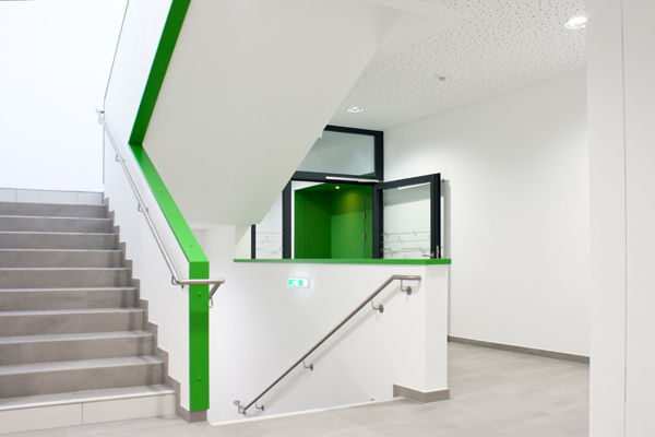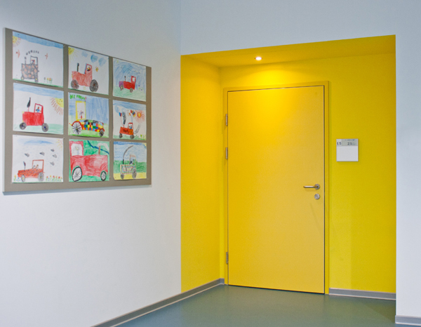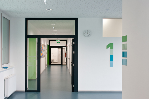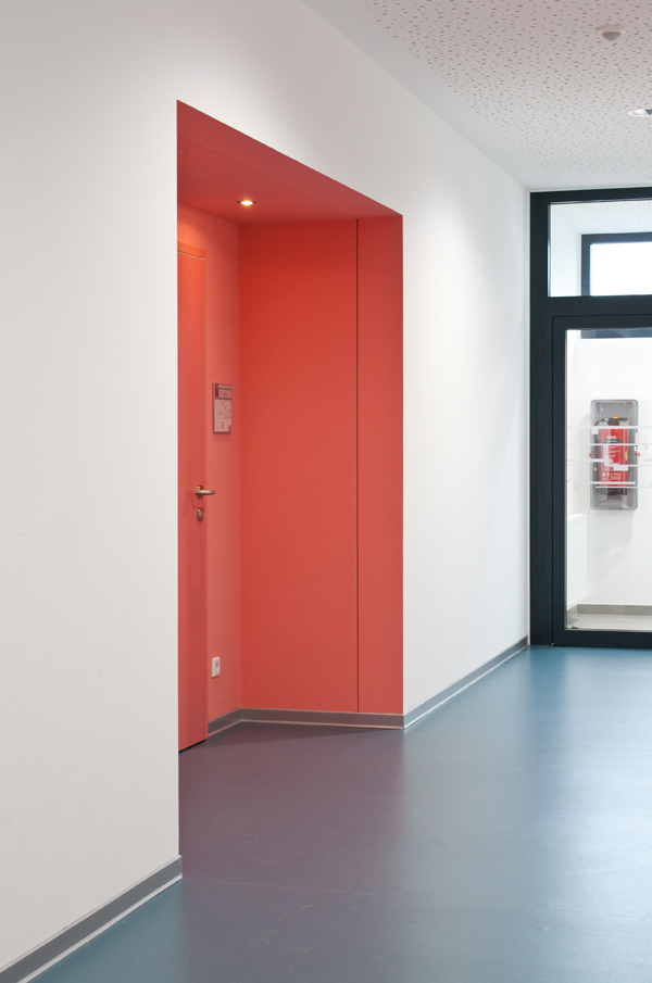 Ein besonderes Highlight sind die in unterschiedlichen Farben ausgebildeten Nischen der Klasseneingänge und Klassenrückwände. Das Farbkonzept bahnt sich seinen Weg von den Garderoben durch die übrigen Geschosse und trägt zur Identitätsstiftung der Schüler mit ihren Klassen bei.