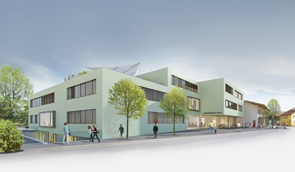 Die Herangehensweise an dieses Wettbewerbsprojekt war, das Grundstück möglichst flächenmässig auszunützen, jedoch den Baukörper ein wenig zu gliedern, damit er sich in seiner Maflstäblichkeit den umliegenden Nachbarschaftsgebäuden anpasst. So scheint es nun als hätte man 2 Kuben entlang der Bauflucht gegeneinander verschoben und mit einem Gang verbunden. Dieser entstandene Gangbereich bildet teilweise Nischen aus, Sitznischen hinter einem Panoramafenster, wo sich die Kinder in der Pause versammeln können.