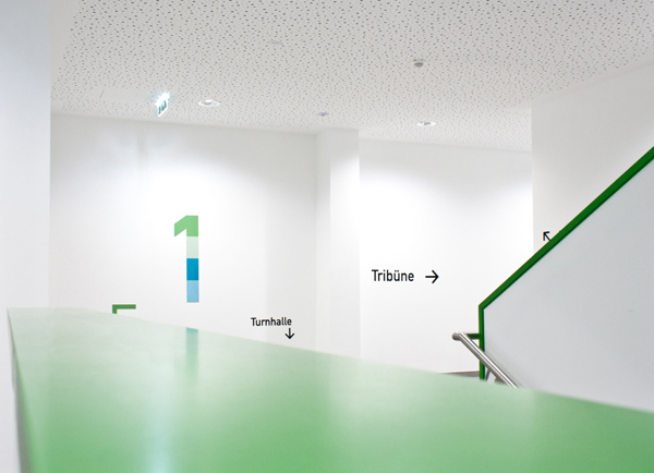 Um zukünftig die bestehende Turnhalle in seiner Nutzung aufzuwerten, wurde der Neubau mit einem transparenten Verbindungsstück an den Bestand angedockt. über diesen attraktiven Zugang werden nun unabhängig vom Schulbetrieb Vereinsmitglieder und Veranstaltungsteilnehmer über das Foyer in die Turnhalle oder in den Garderobenbereich geleitet.