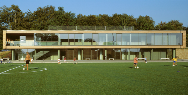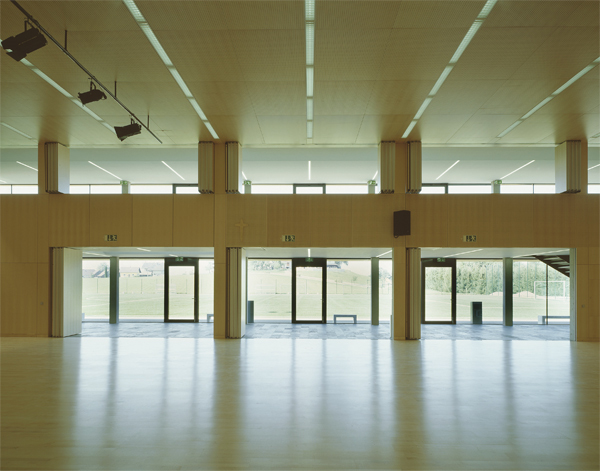 Das Gebäude wurde den natürlichen Geländehöhen angepasst, sodass fließende Übergänge und Verschränkungen zwischen Innen- und Außenraum ermöglicht werden. Das Niveau des höher gelegenen Spielfeldes wird mit der offenen Terrasse des Obergeschosses aufgenommen, sodass ein stufenloser, fließender Übergang in die Landschaft sowohl im Unter- als auch im Obergeschoss entsteht.