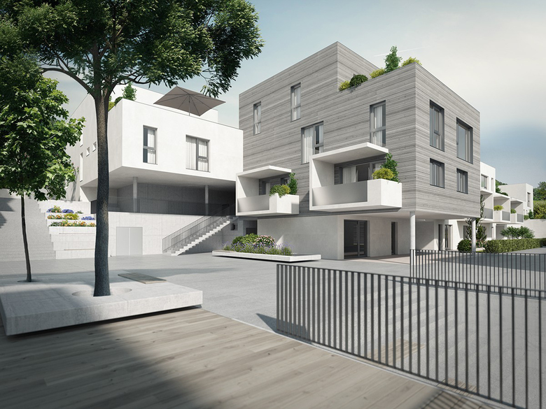 Die besondere Lage des Grundstückes (Ausrichtung n. Westen) im Landschaftsraum, sowie die Hangtopografie erfordern einen besonderen städtebaulichen Ansatz. Die Antwort darauf fanden wir in einer kleingliedrigen, dörflichen Struktur und in weiterer Folge die daraus resultierende, angenehme Maßstäblichkeit von 2- bis 3-geschoßigen Baukörpern.