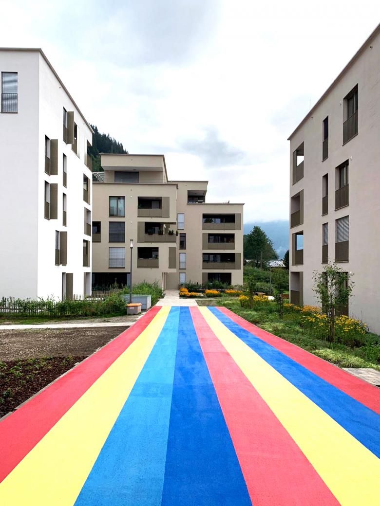 Die Voraussetzungen dafür waren nicht unbedingt einfach, in einem eher ländlichen Umfeld eine Siedlung mit einer hohen Dichte zu bauen, welche noch dazu direkt an der Bundesstraße liegt. Aber es wurde eine architektonisch zeitgemäße Ausdrucksform gefunden, die einerseits einem urbanen Quartier entspricht, sich andererseits durch ihre Maßstäblichkeit gut in die Umgebung einfügt. Zudem machte man sich die Auflage einer 5m hohen Lärmschutzwand im Süden der Siedlung zu Nutze und antwortete mit einer multifunktionellen Gestaltung.