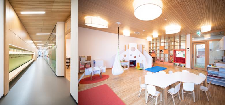 Die Baukörper bilden ein harmonisches Ensemble mit Plätzen und Sichtachsen und weisen eine einheitlich reduzierte, geradlinige Formensprache unabhängig ihrer Nutzung auf. Erdtöne ergänzt durch dunkle Holzfassadenelemente bilden das Grundgerüst für den Material- und Farbmix.