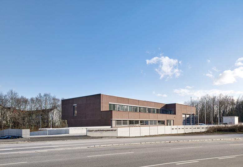 Das dreigeschossige Gebäude wurde mit einem Geschoss in die Böschung eingegraben, das Gelände terrassiert. Auf dem höheren, nach Westen orientierten Niveau ist die Fahrzeughalle der Rettungswache angeordnet, versetzt dazu findet sich ein Stockwerk tiefer die Halle der Feuerwache; sie ist nach Osten orientiert. Die Vorflächen beider Hallen sind über Rampen und eine Gebäudeumfahrt miteinander verbunden. Dadurch sind für alle Fahrzeuge drei Ausfahrten auf die das Gebäude umschließenden Straßen möglich. Zwischen den beiden Hallen liegt das Treppenhaus, es verbindet die Feuer- und die Rettungswache miteinander und ist das zentrale Gelenk zwischen den verschiedenen Funktionsbereichen. Im südlichen Teil liegen unter der kleinere Halle Werkstätten, Lager- und Technikräume, hinter ihr im Erd- und Obergeschoss die Ruheräume, während die Aufenthaltsräume größtenteils über der größeren Halle angeordnet und nach Westen zu einer langen Dachterrasse hin orientiert wurden. Diese Terrassenfläche wurde gewonnen, in dem das Gebäude an seiner Westseite im Obergeschoss zurückgesetzt wurde, auf der Ostseite kragt es stattdessen aus, so dass Werkstattbereiche und Fahrzeughalle hier eine überdachte Vorzone erhalten. Die dadurch erzielte skulpturale Wirkung gliedert den langgestreckten Baukörper und nimmt den hohen Hallentoren die Dominanz, die horizontale Fassadengliederung betont die Längsrichtung zusätzlich und lässt das Gebäude schlank und elegant erscheinen, eine Eigenschaft, die noch dadurch verstärkt wird, dass auch die Brüstungen im Freibereich auf das Gebäude bezogen sind und die räumliche Konzeption veranschaulichen.