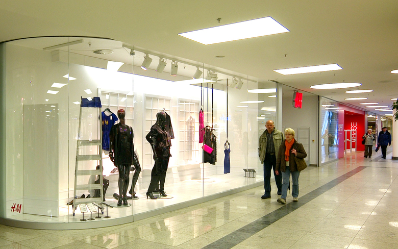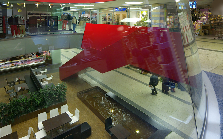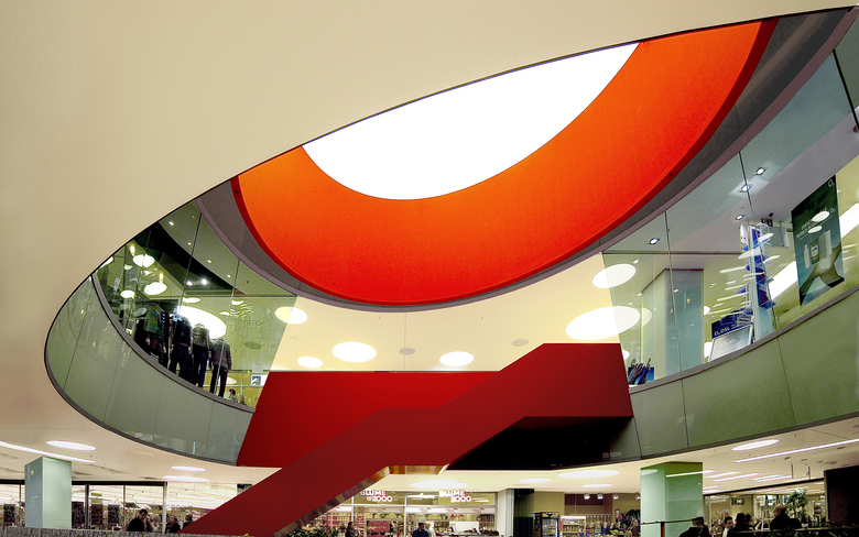 Die Mallfassade wird als Übergangsbereich zwischen Mall und Laden interpretiert, nicht als Abschluss oder gar Schwelle zwischen öffentlichem und privatem (Verkaufs-)Raum. Je nach Anforderung und Konzept der Ladenplanung werden raumhohe Ganzglas- Falt- oder Schiebeanlagen vorgesehen, die über die gesamte Ladenbreite geöffnet werden können oder rahmenlose Festverglasungen mit raumhohen Schiebe- oder Drehflügeln. Die Festverglasungen sollen als Membran Transparenz ausstrahlen. Sie können auf Wunsch des Mieters mit transluzenten Aufdrucken versehen werden oder Beschriftung in Form von eingeätzten Buchstaben tragen. Die Ladenverglasung verläuft grundsätzlich vor den Stahlbetonstützen oder deutlich abgelöst dahinter. Die rigide Rhythmisierung der Mallfassaden durch die Stahlbetonstützen, die im Bestand die Abgrenzung Mall - Läden betont, soll durch fließende Übergänge aufgehoben werden. Dazu tragen auch die im Grundriss gekrümmten Fassadenverläufe bei.