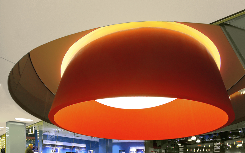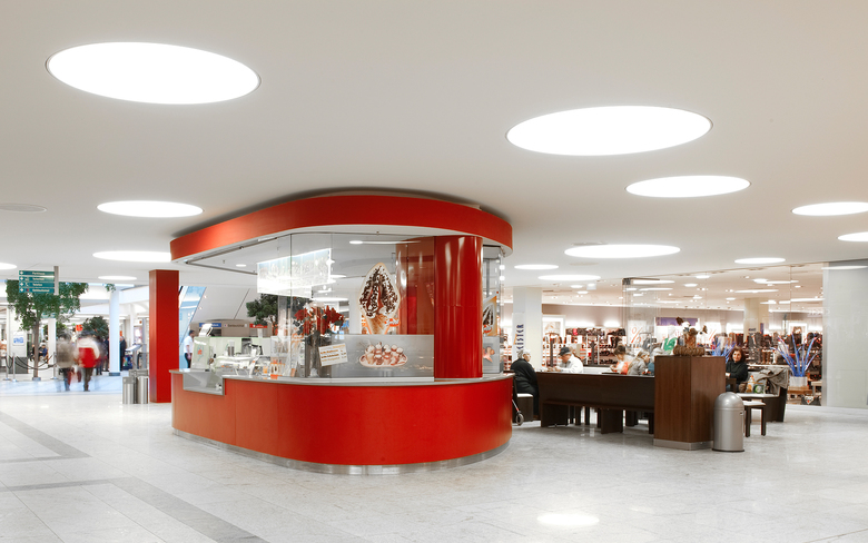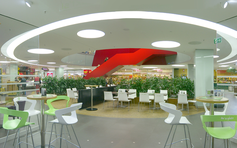 Im Lichthof 3 entstand ein Food Court. Dieser gliedert sich in sechs Mietbereiche von Imbissanbietern und einen zentral gelegenen Bestuhlungsbereich. Jedem Mieter ist ein definierter Bereich dieser Bestuhlung zugeordnet, es wird aber ein geschlossenes Erscheinungsbild angestrebt. Deshalb übernimmt der Vermieter die Planung und Einrichtung, die Kosten werden auf die Mieter aufgeteilt. Der Food Court wird räumlich durch einen Glaskegel geprägt, der die elliptische Deckenöffnung durchdringt und in Ebene 2 zugleich die Fassaden der bis an den Lichthof vorgezogenen Läden bildet. Der obere Abschluss dieser Großform wird durch ein Lichtobjekt geformt, das ebenfalls ein leicht gekippter Kegelstumpf ist.