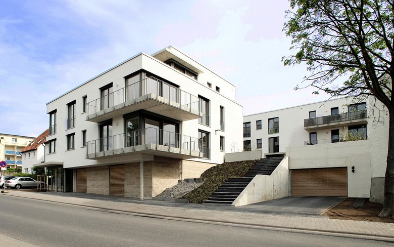 Die aus vier Gebäuden bestehende Wohnbebauung fügt sich harmonisch in die gewachsene Stadtstruktur. Die geschlossene Bauweise des Bestandes an der Mainzer Straße wurde aufgegriffen und entsprechend umgesetzt. Der Einzelhauscharakter wird durch die ortstypisch versetzten Fassadenfluchten und den Materialwechselvon Putz und Muschelkalkmauerwerk betont. Die Solitäre passen sich der offenen Bauweise an der Ottonenstraße an. Der öffentliche Fußweg wird aufgenommen und der Gebäudedurchgang erlaubt die Querung des Grundstückes vom Kreiskrankenhaus zum Bibelgarten und der Remigiuskirche.